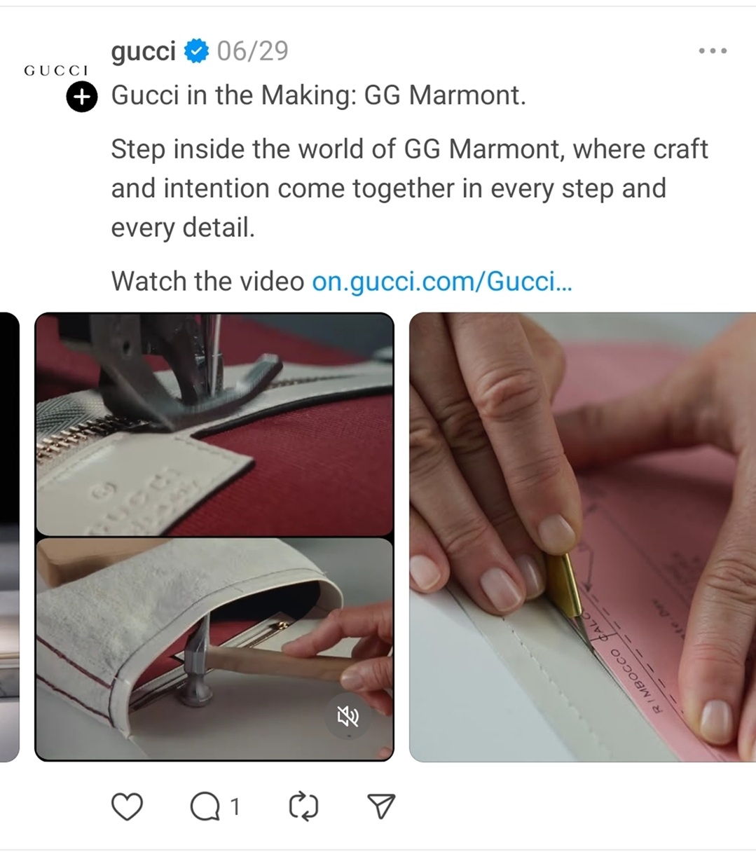디지털 채널 운영에 있어 항상 한발 앞서 나가는 패션 브랜드인 ‘구찌’도 텍스트 플랫폼을 적극 활용하고 있다. 2025년 7월 기준 구찌는 X(구 트위터)와 스레드 모두에서 700만 명 이상의 팔로워를 보유하며 텍스트 플랫폼에서 확실한 존재감을 보여주고 있다.