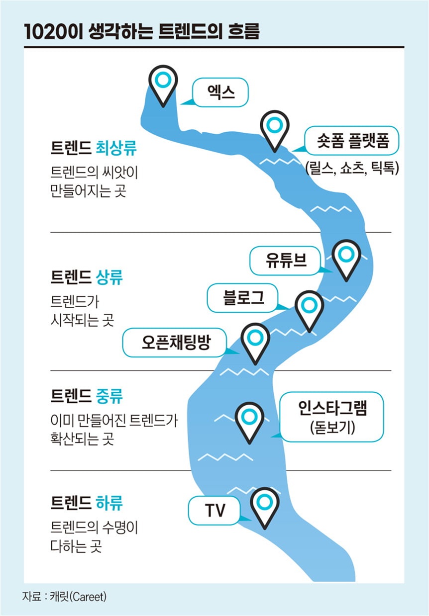실제로 1020세대는 트렌드의 시작점을 텍스트 기반 플랫폼인 엑스(구 트위터)로 인식하고 있다. 대학내일의 트렌드 연구소이자 미디어인 캐릿(Careet)의 조사에 따르면, 트렌드는 텍스트 플랫폼인 엑스에서 시작해 쇼츠나 틱톡 같은 숏폼 콘텐츠, 유튜브, 블로그 등을 거쳐 중류 단계인 인스타그램으로 퍼지고, 마지막으로 TV에 도달하는 흐름을 보인다.