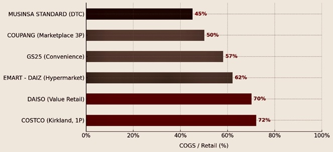 플랫폼별로 보면 코스트코의 ‘커클랜드 시그니처(Kirkland Signature)’는 약 70%대 원가율로 운영된다. 회원제 기반의 초저마진 구조로 소비자 신뢰를 확보하는 전략이다. 최근 코스트코에서 매입하는 국내 패션 브랜드도 매입가격이 통상 80% 안팎이다. 다이소 역시 초저가·초회전 모델로 평균 원가율이 70% 전후에 달한다. 이마트 DAIZ, GS25 등도 PB를 전면에 내세워 원가율 60% 안팎, 합리적 품질의 ‘베이직 상품’을 공급하고 있다. 무신사 스탠다드는 D2C(직접판매) 모델을 통해 원가율 45% 수준에서 품질과 디자인을 병행하며 플랫폼 내 수익의 핵심축으로 자리 잡았다.